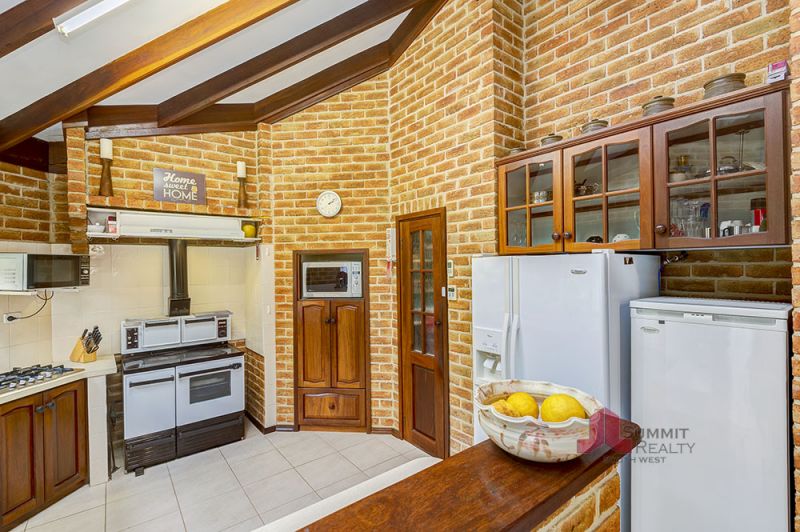 Functional kitchen featuring Jarrah cupboards, walk-in pantry and double fridge recess