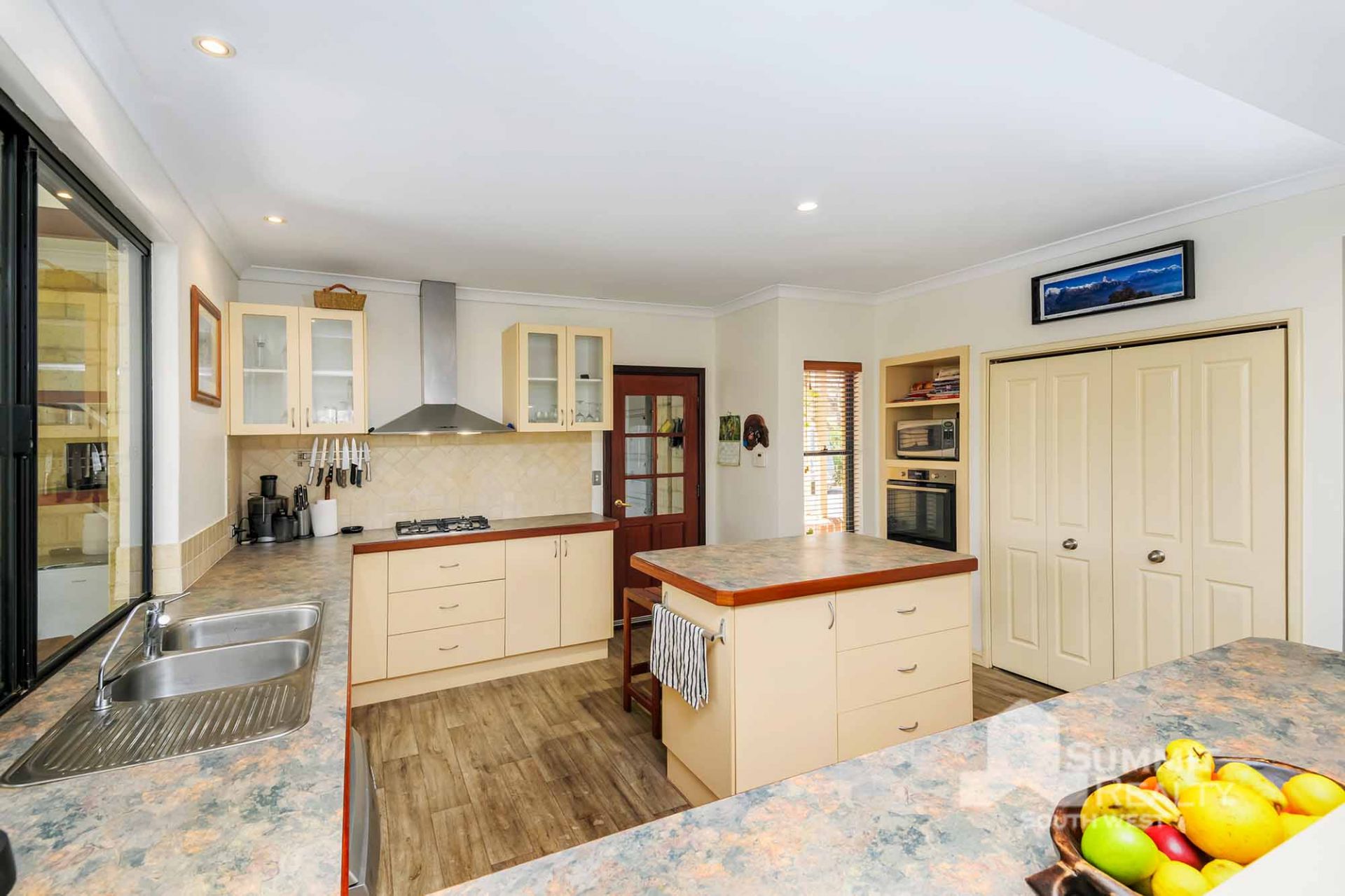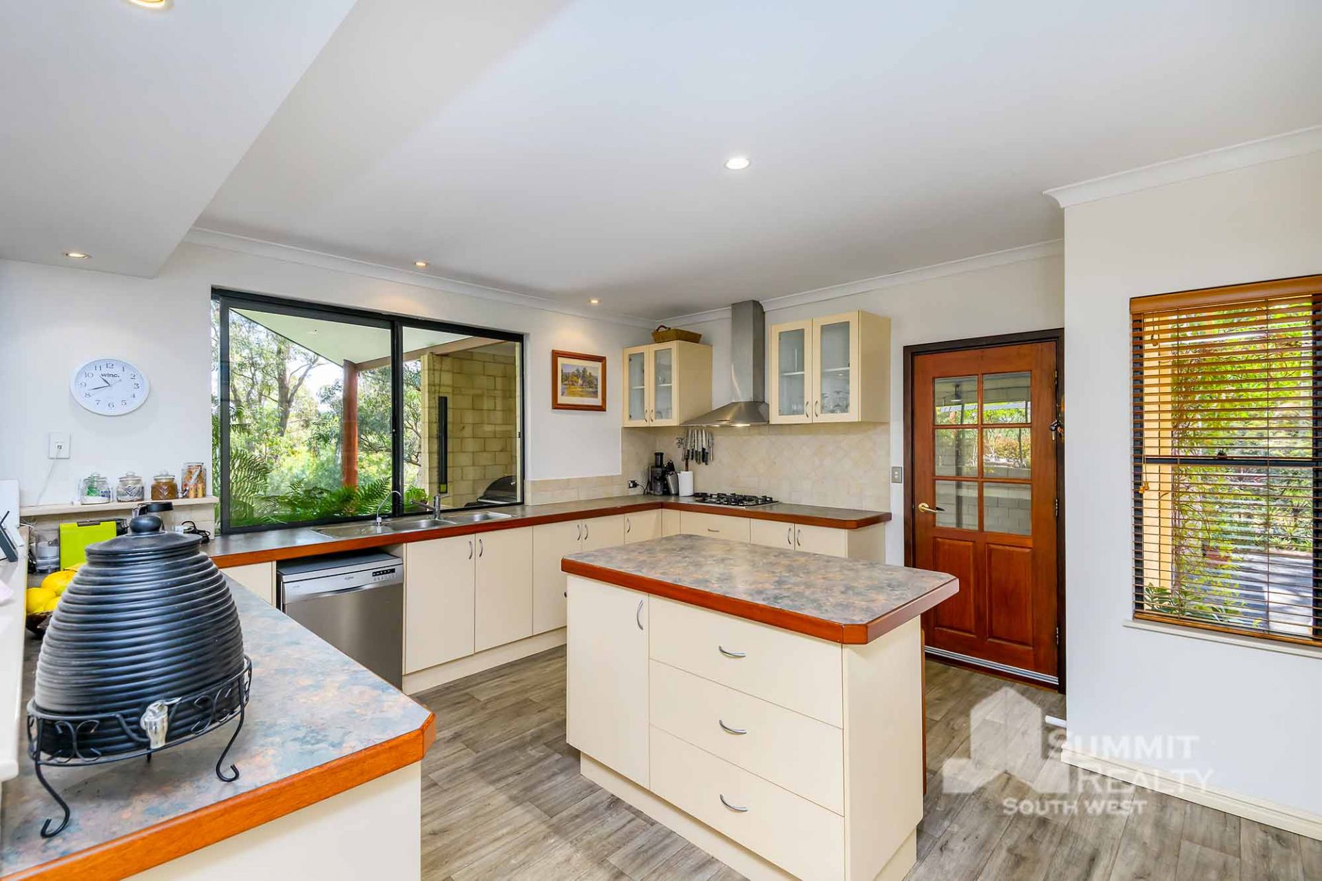 For those who love to cook and entertain, the kitchen is a dream. With views of the manicured back garden, ample storage, and a central island bench, it’s perfect for both casual family meals and hosting guests.