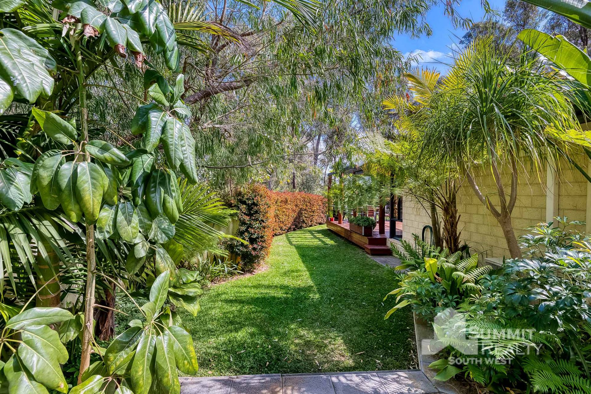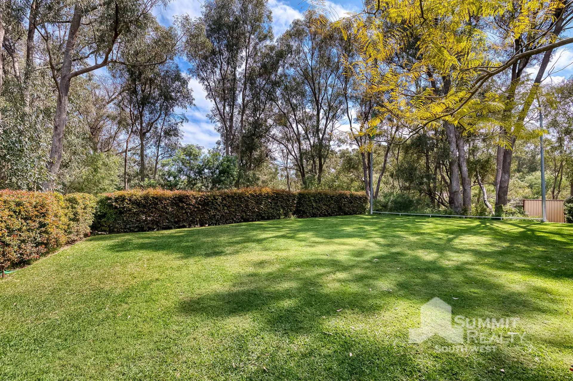 Beautifully landscaped backyard with trees and hedging