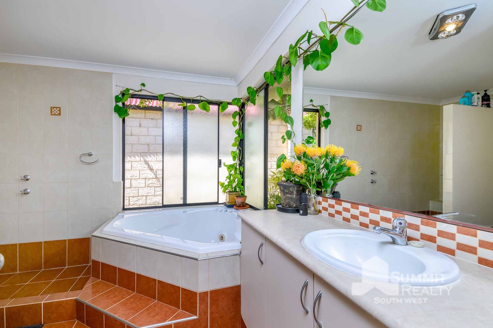 Step into the spacious master bedroom, featuring a luxurious spa bath and private access to the pergola. Imagine relaxing in your own retreat with florals wrapping around, adding to the peaceful atmosphere.