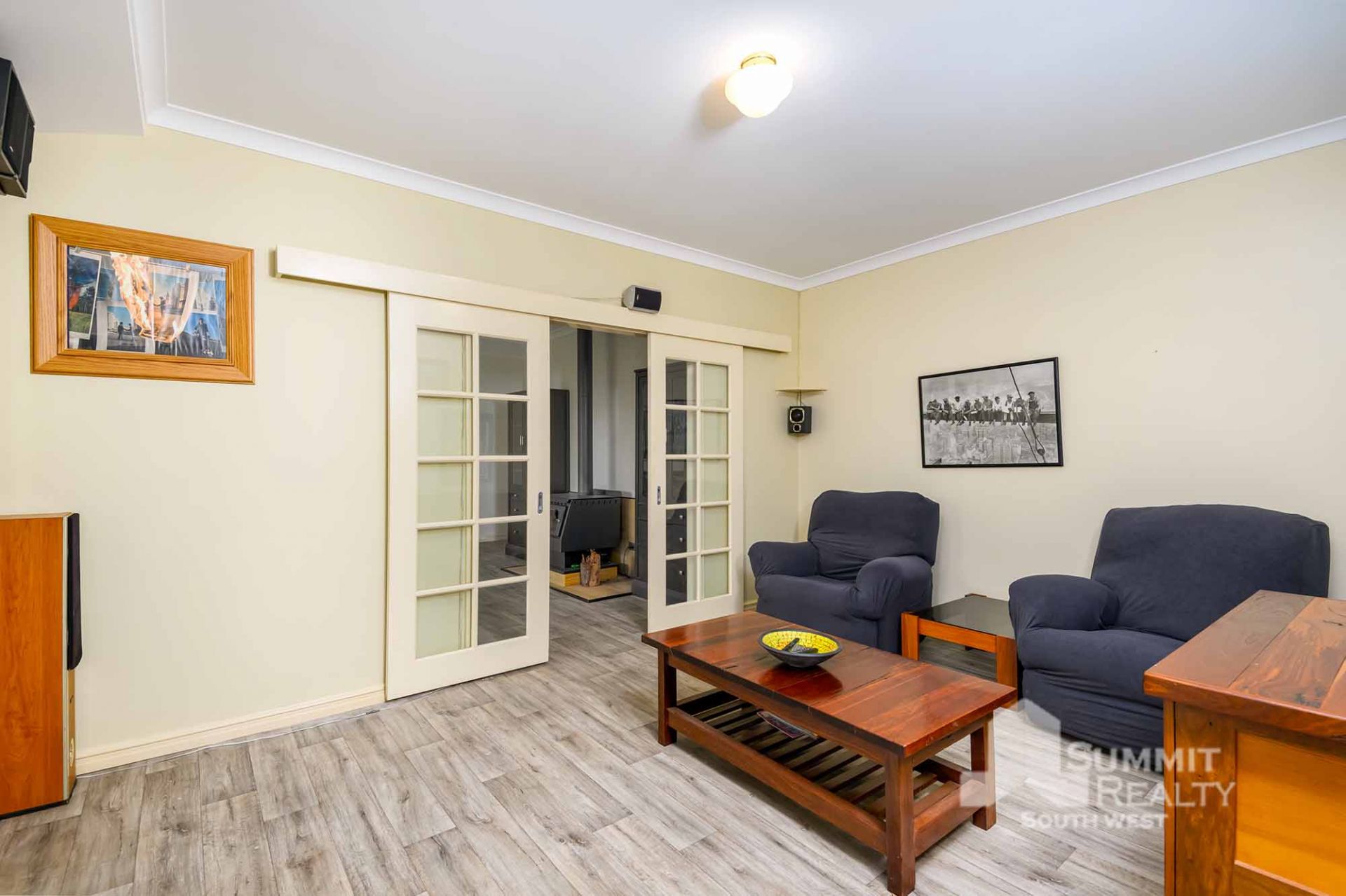 The open-plan living area boasts soaring ceilings, a cozy wood fire, and fresh paint throughout, leading to the theatre room where you can enjoy movie nights in style.