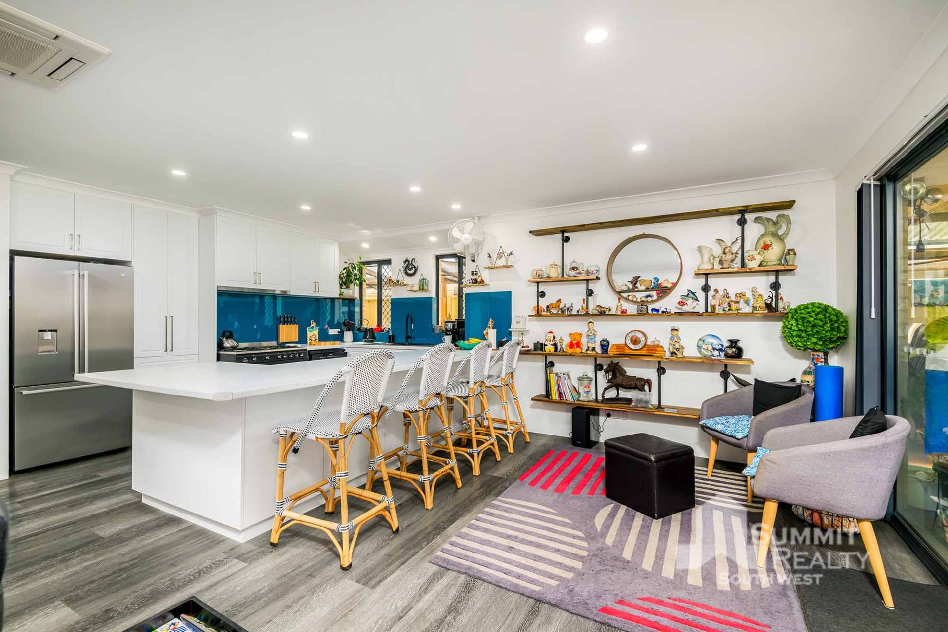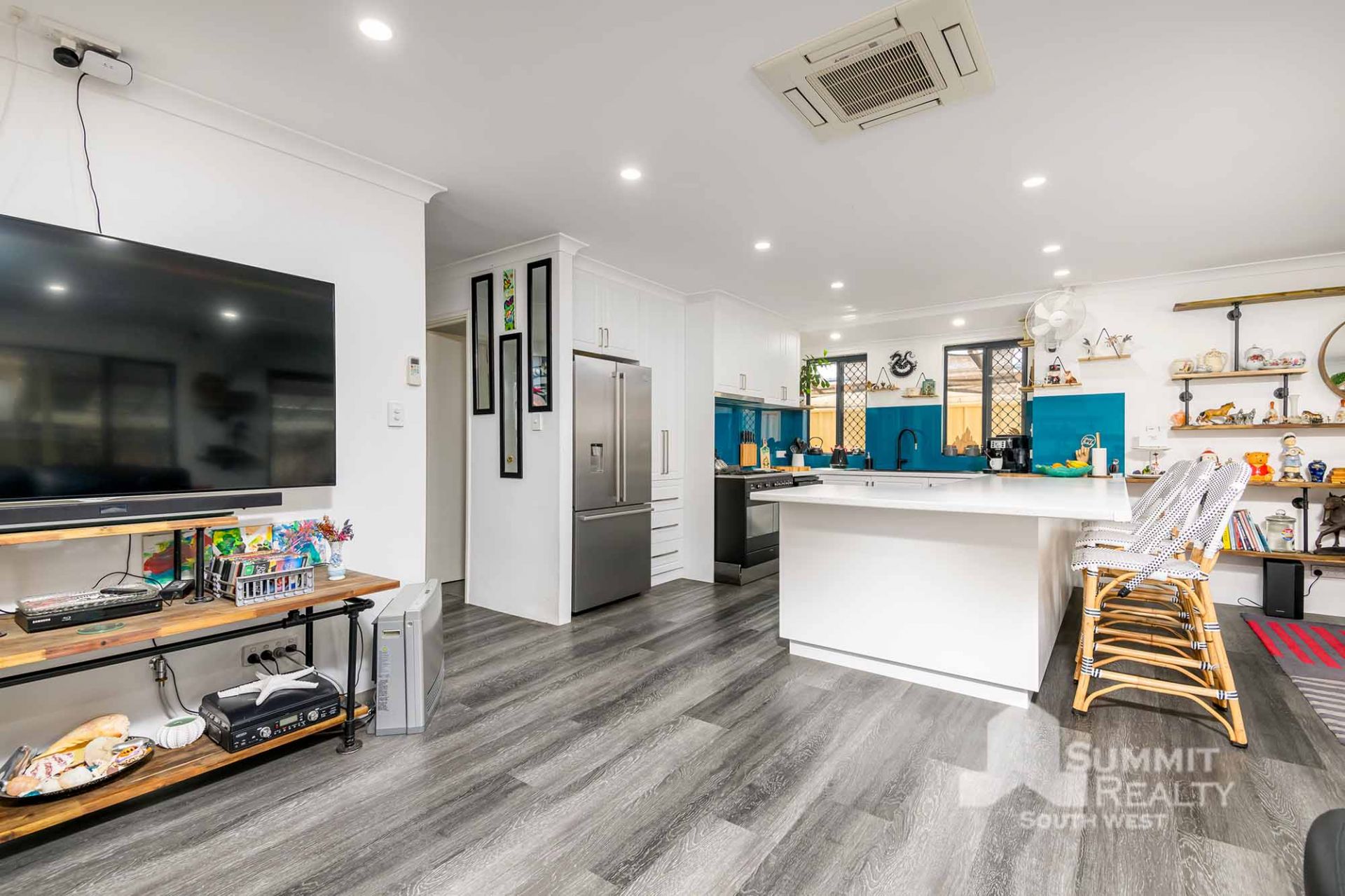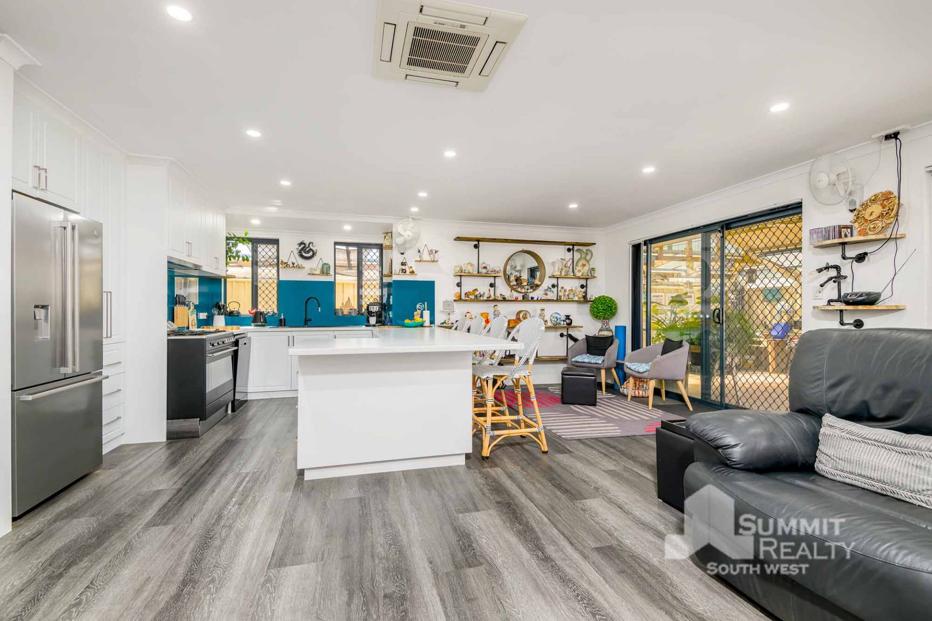 Open plan living style with wood look flooring throughout