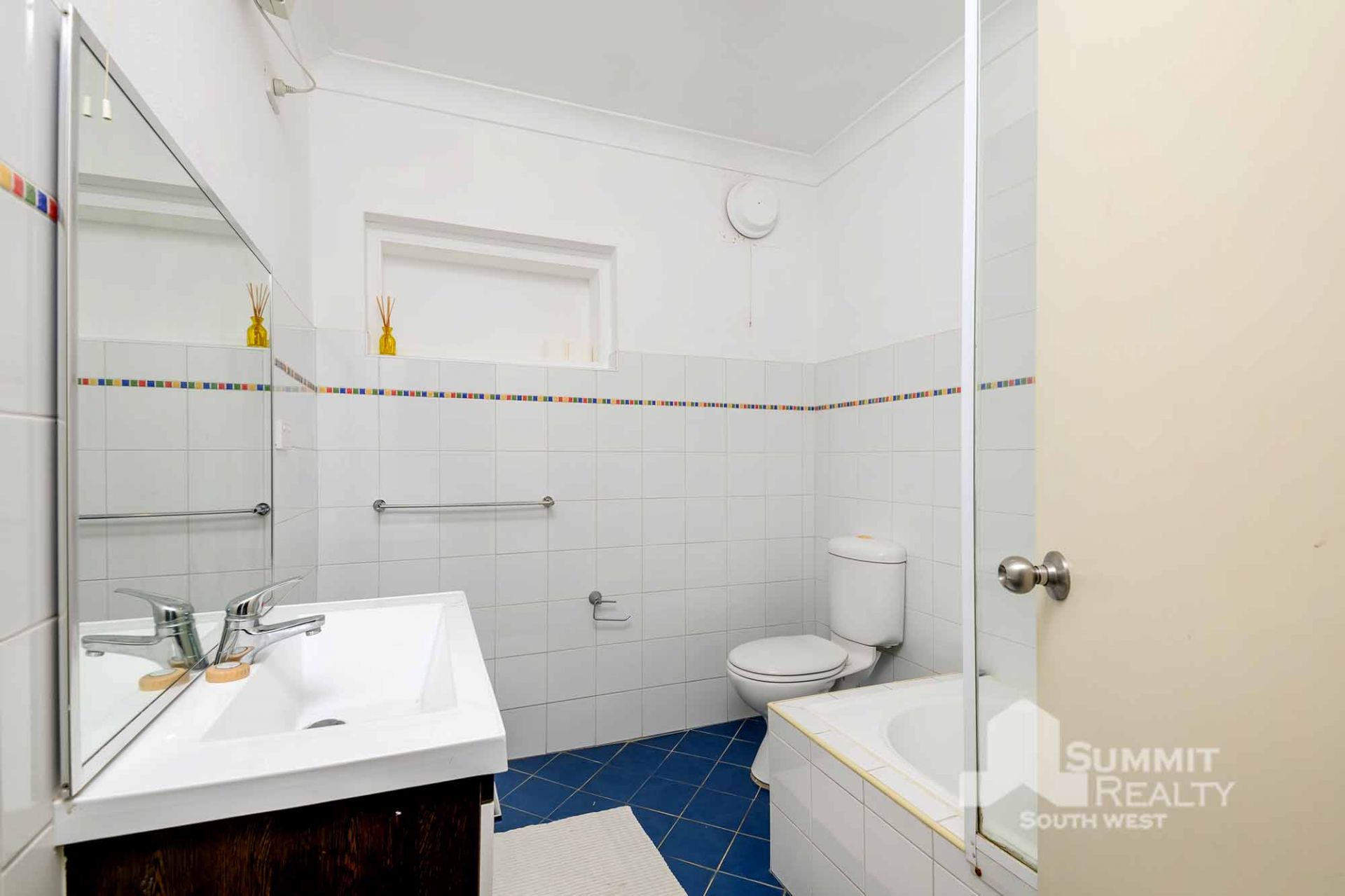 The main bathroom, featuring floor-to-ceiling tiles and a double vanity, is easily accessible from the living areas, along with a spacious laundry with plenty of storage.