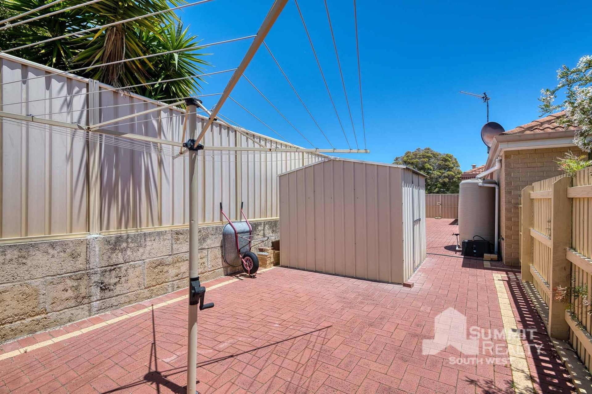 Functional Backyard: A garden shed/workshop provides storage and space, with potential for a larger shed, plus a classic Hills Hoist washing line.