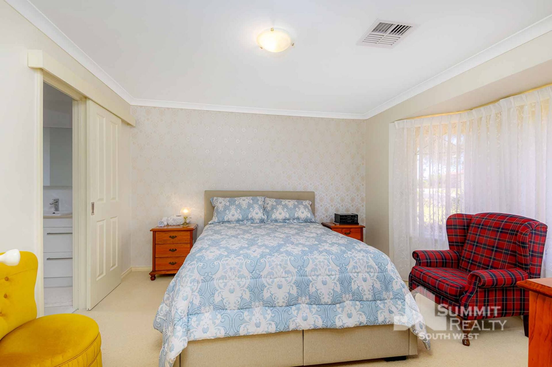 Comfortable Main Suite: Carpeted main bedroom features a walk-in robe and a stunning wallpaper feature wall, creating a cozy retreat.