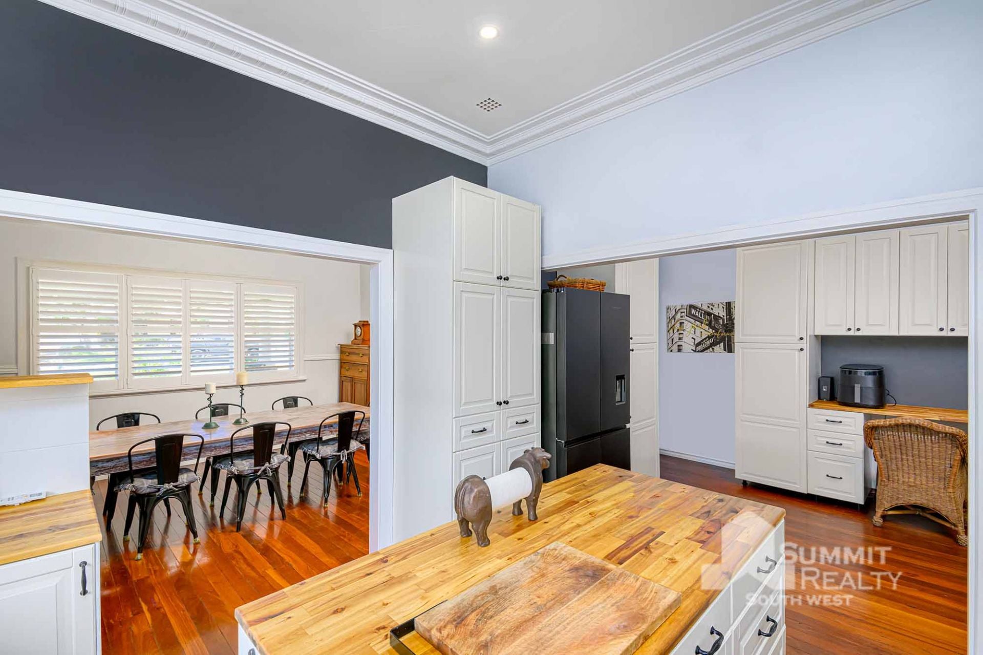 Step inside to discover a beautifully renovated kitchen including high decorative ceilings and boasting sleek finishes and state-of-the-art appliances, perfect for culinary enthusiasts.