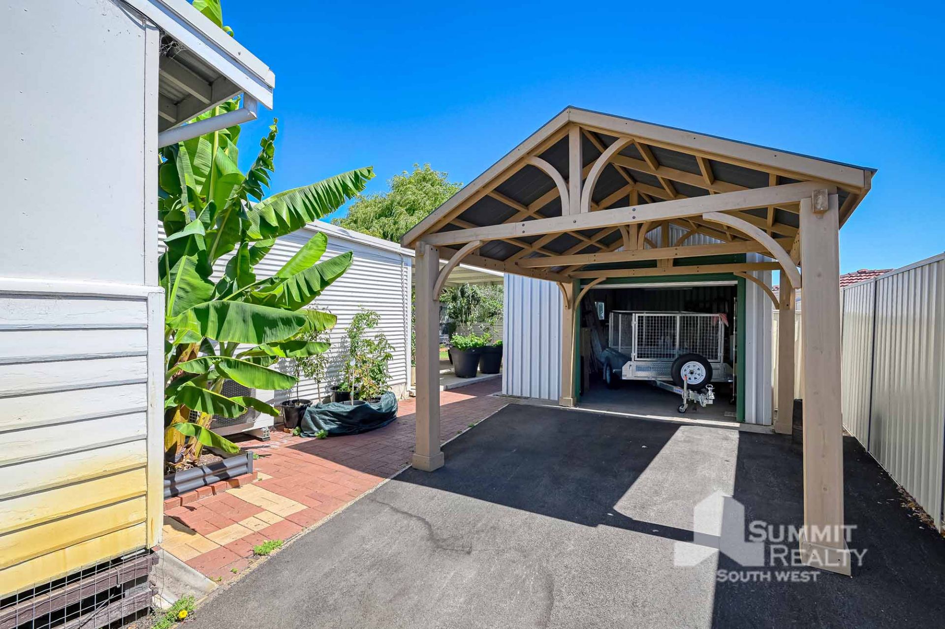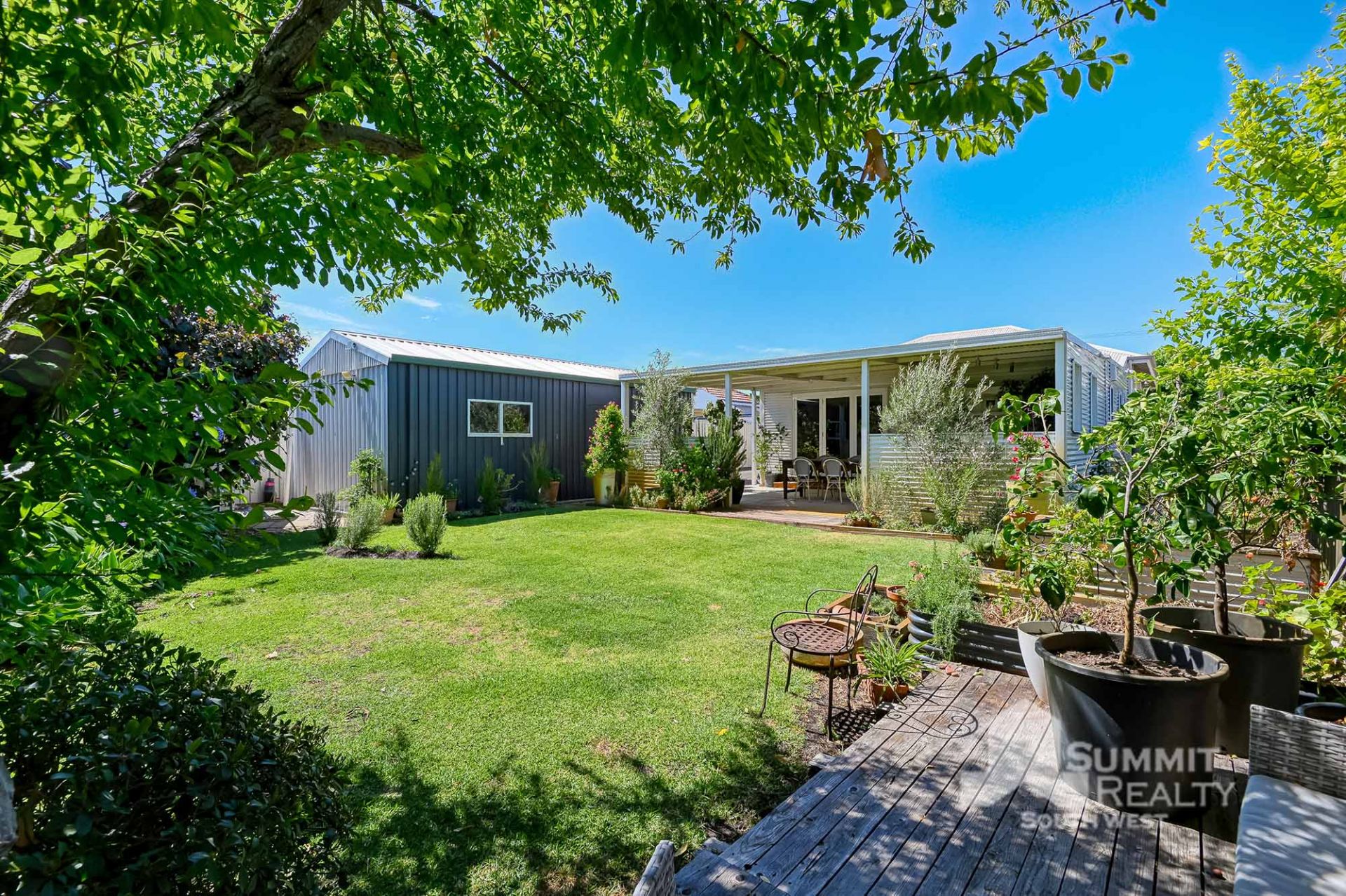 The generous-sized undercover patio is an entertainer’s delight, providing the ideal space for hosting gatherings or enjoying tranquil evenings outdoors. Surrounding the home, you’ll find meticulously maintained lawns and established gardens that create a serene and picturesque setting. For those who appreciate extra storage or workshop space, the powered shed offers practicality and versatility.