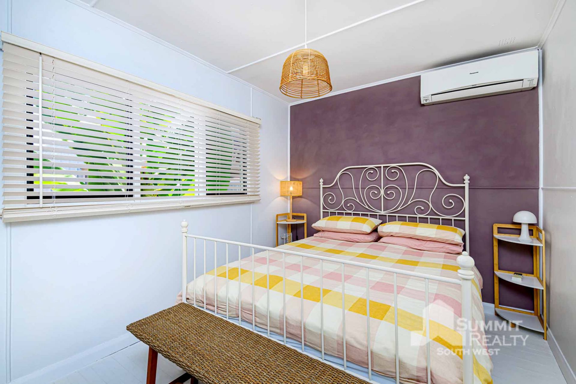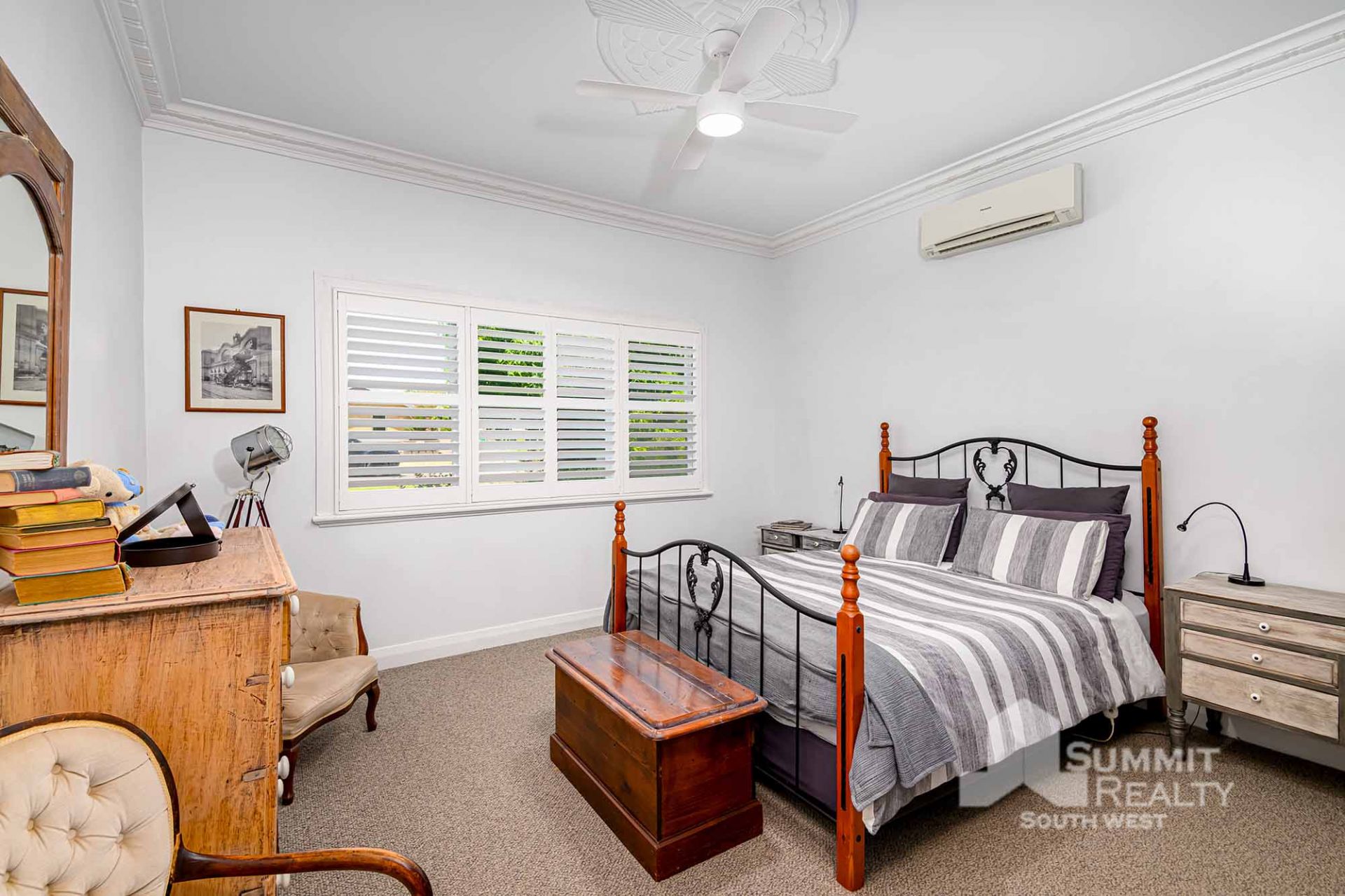 Master bedroom with ensuite, plantation shutters and split system air conditioner