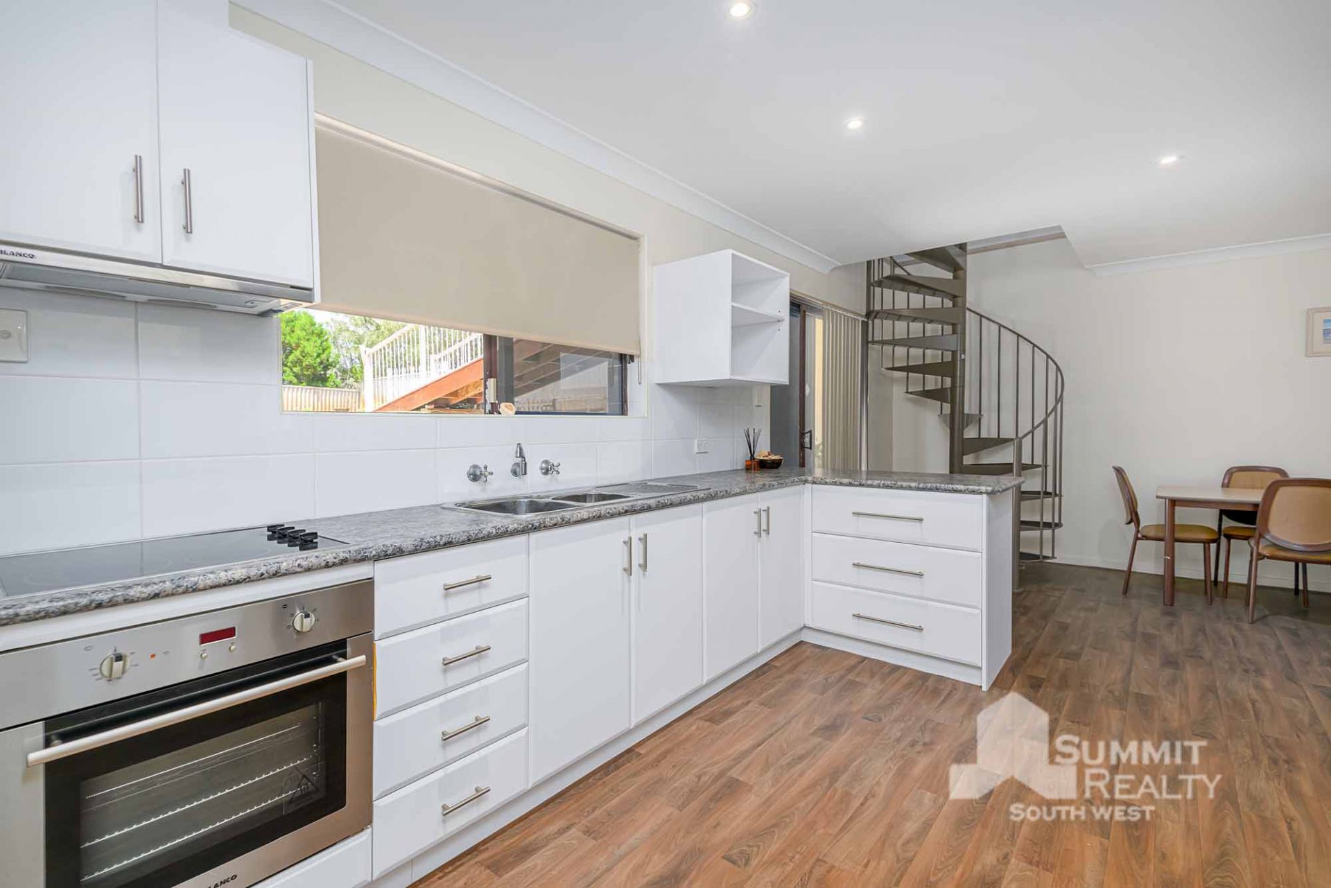 Come in the front door on the lower level and you will find a large tiled entry. On the right hand side is a good sized open planned living area with a modern kitchenette that has double sink, electric under bench oven, electric hotplate, rangehood, double sink and fridge recess. The living area has vinyl timber look floors and there is plenty of space for both a dining and lounge area. A spiral staircase provides access to the upper level or this can be closed off to separate the home into two dwellings.