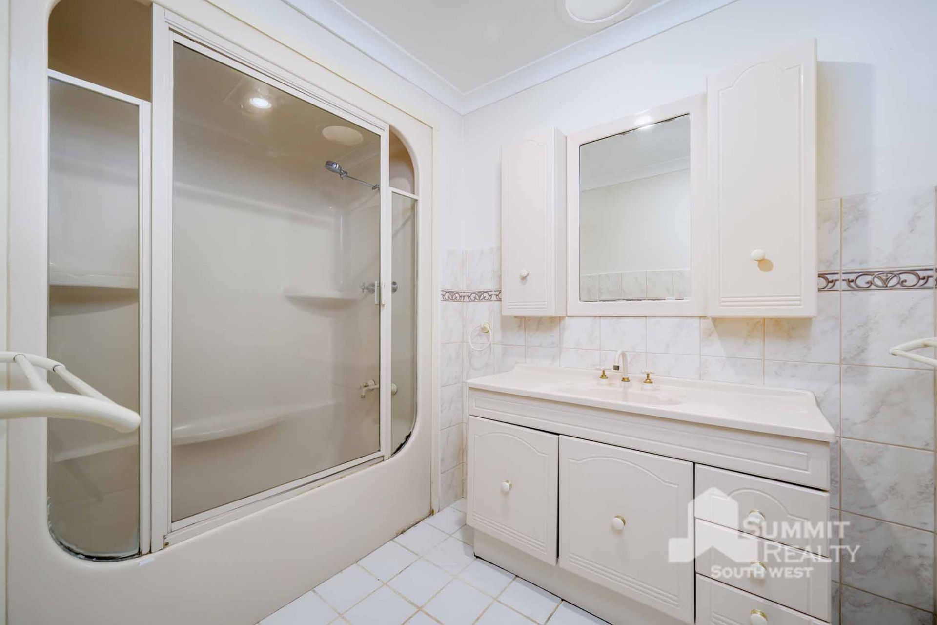 • The bathroom has a screened shower over the bath and a good sized vanity. Wall cupboards either side of the mirror provide additional storage for toiletries and a skylight provides additional light. A separate toilet is close by and central to the bedrooms.