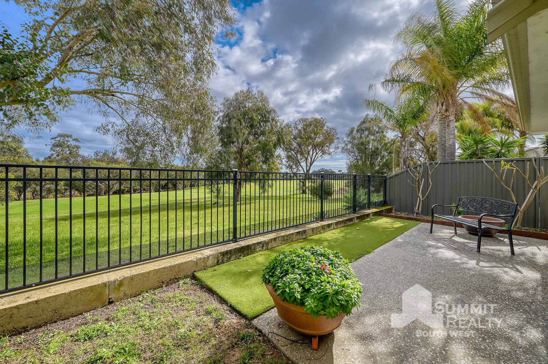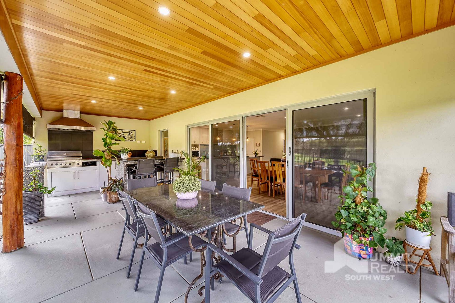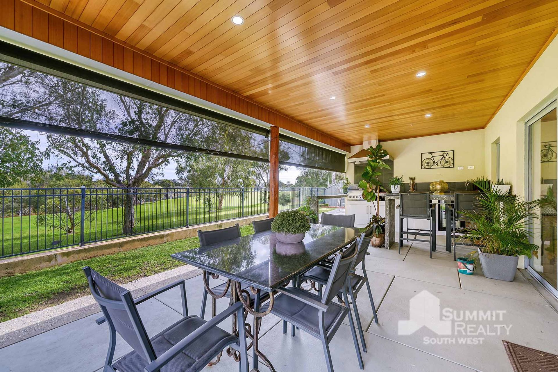 Alfresco entertaining area with built-in BBQ and views across the golf course