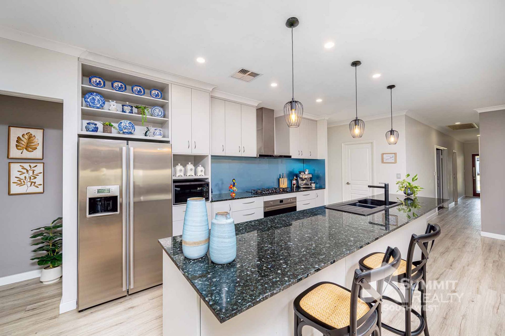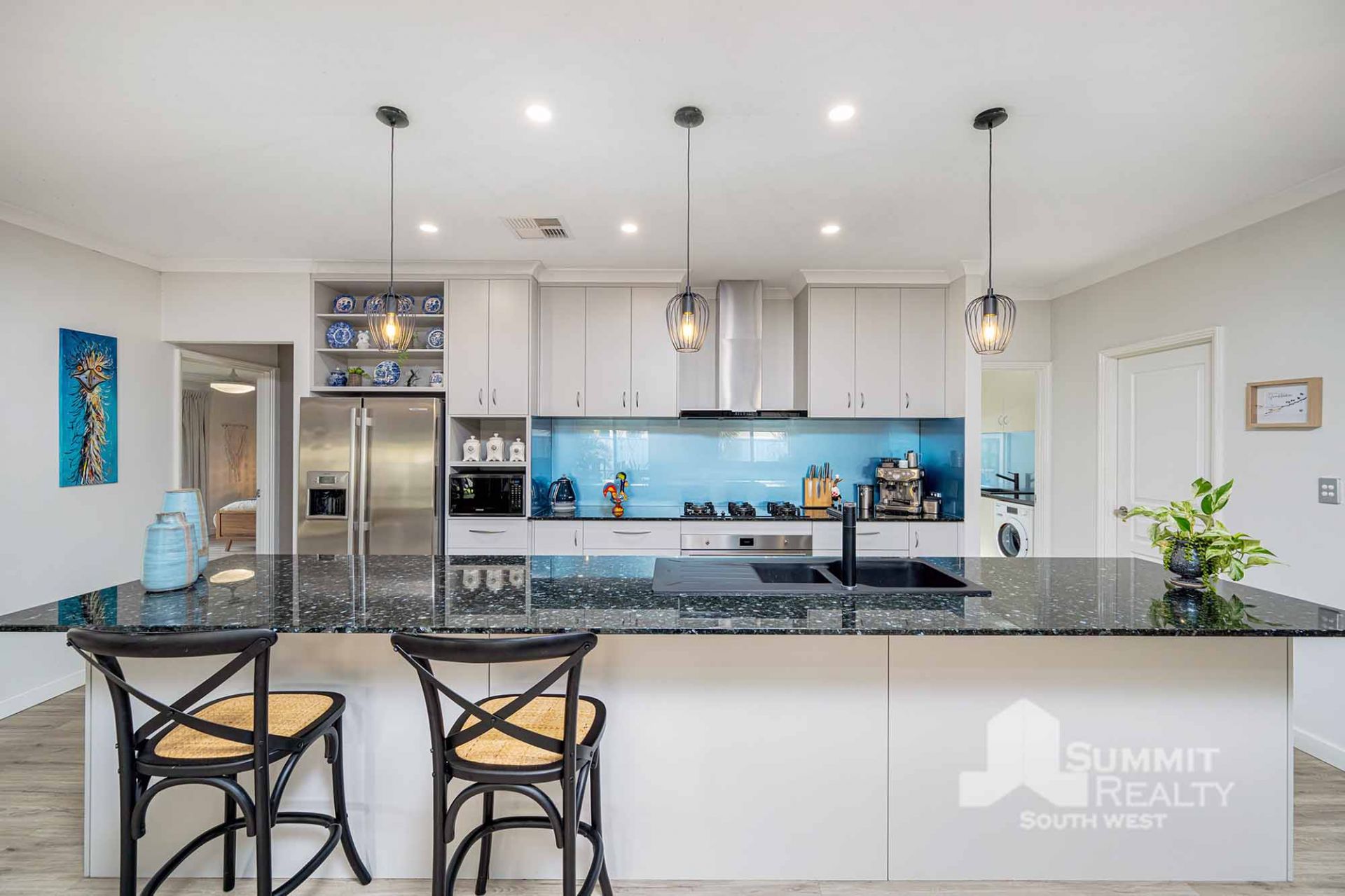 Modern kitchen with granite benchtops, island bench with feature lighting, and dishwasher