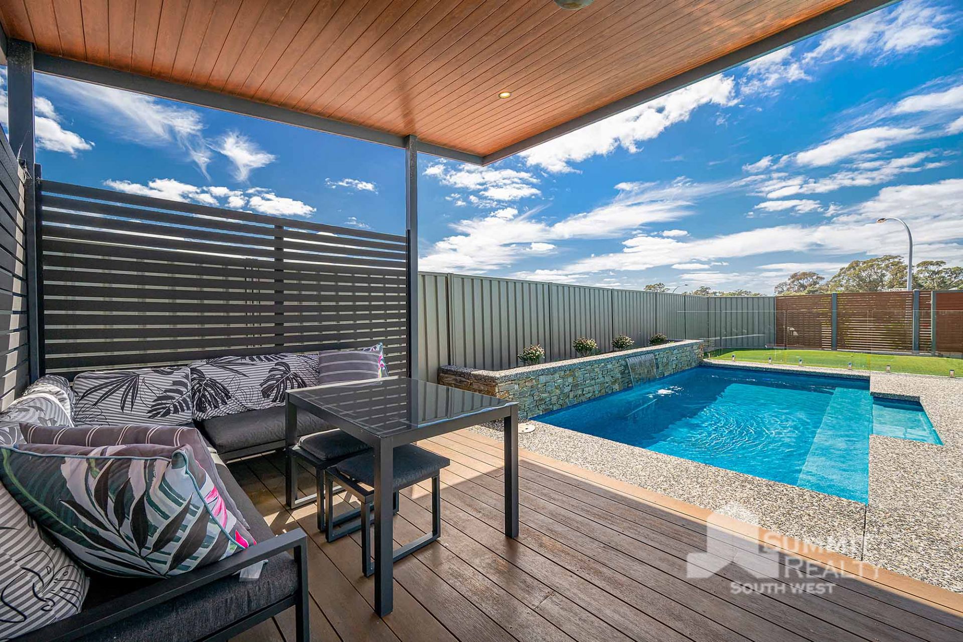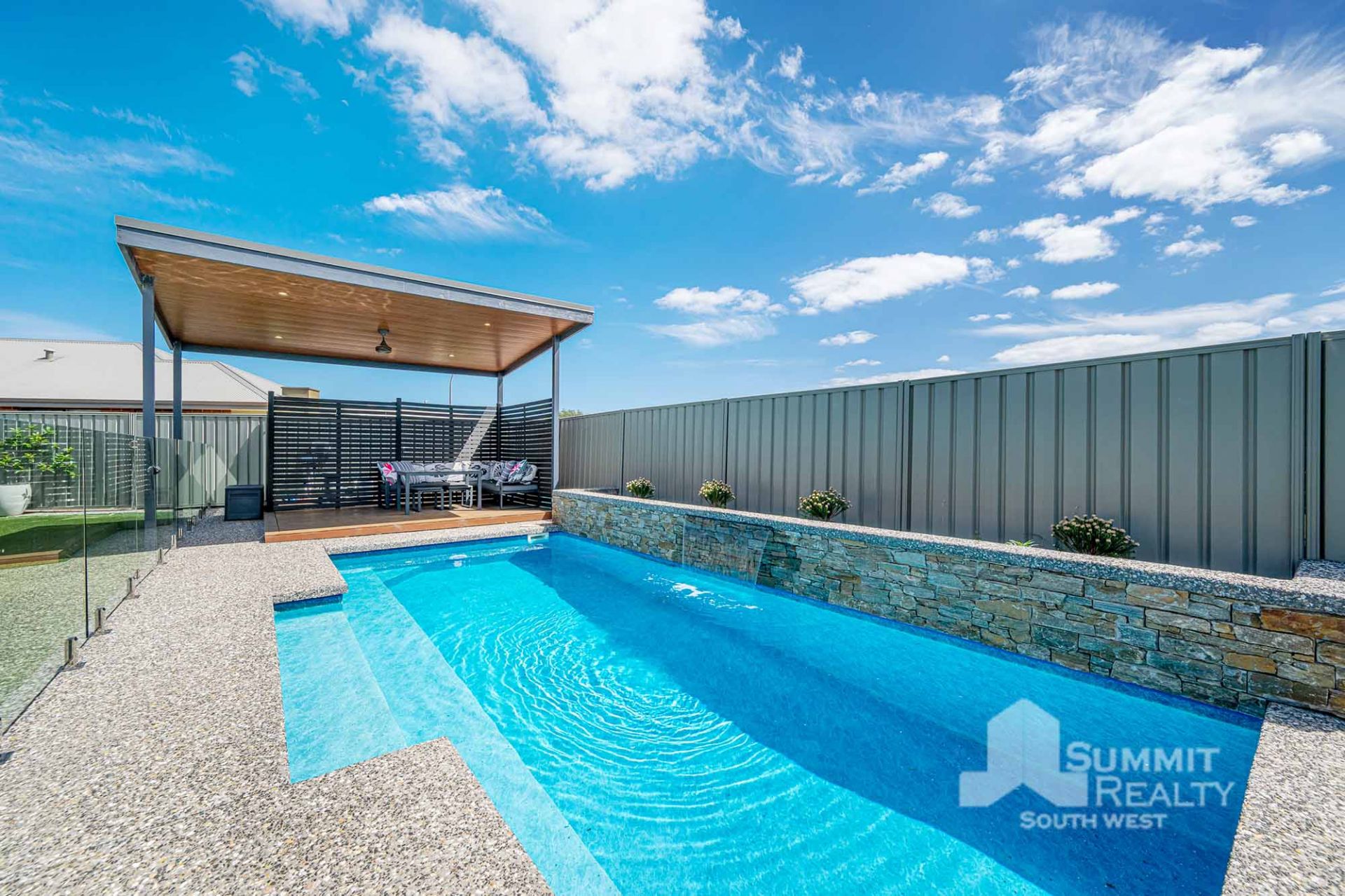 Stylish gazebo overlooking below ground pool