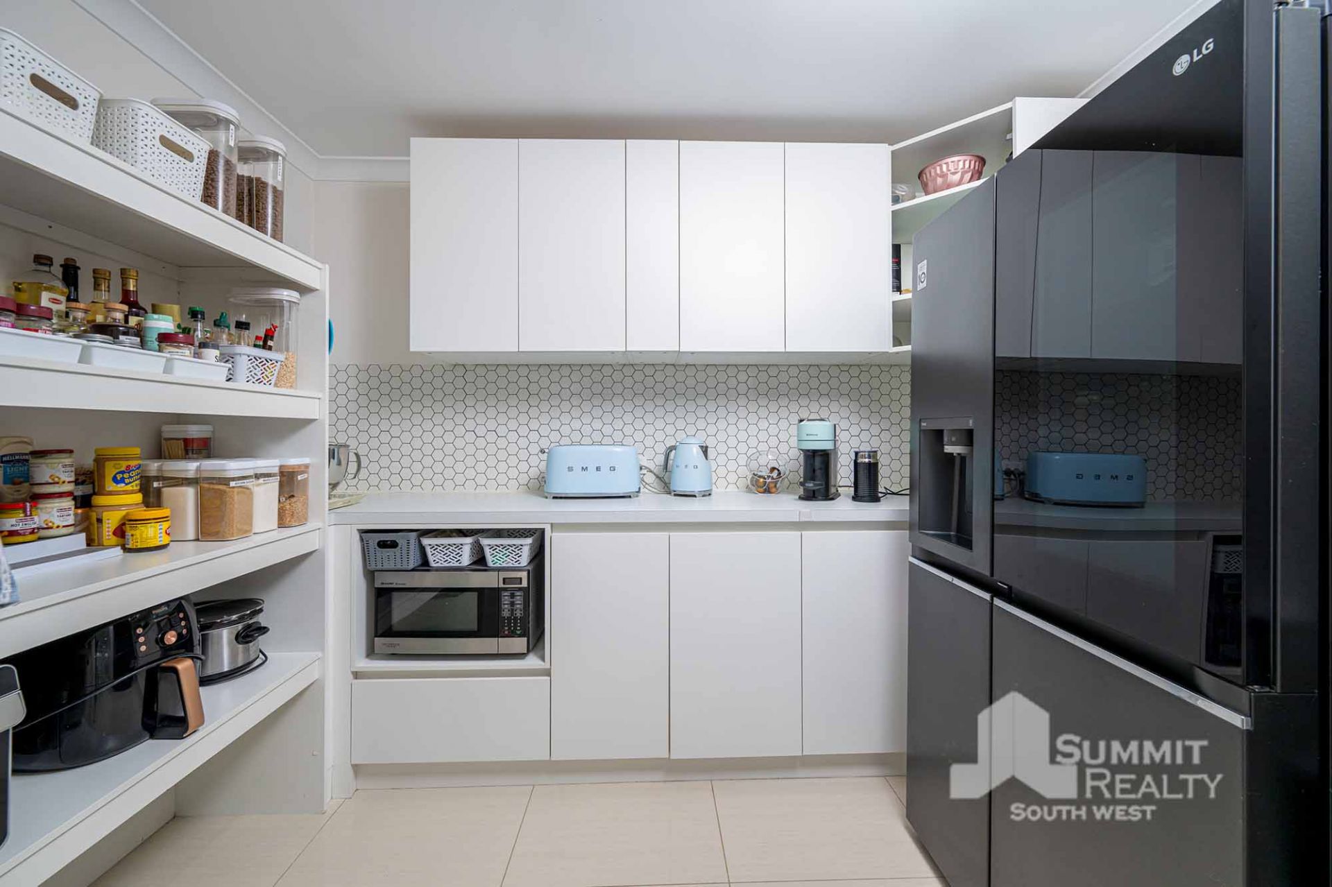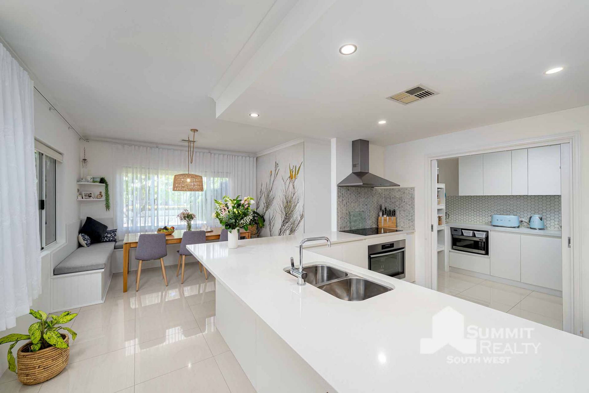 Dream kitchen with extensive bench space, double sinks, induction cooktop, large fridge recess and an impressive walk-in pantry