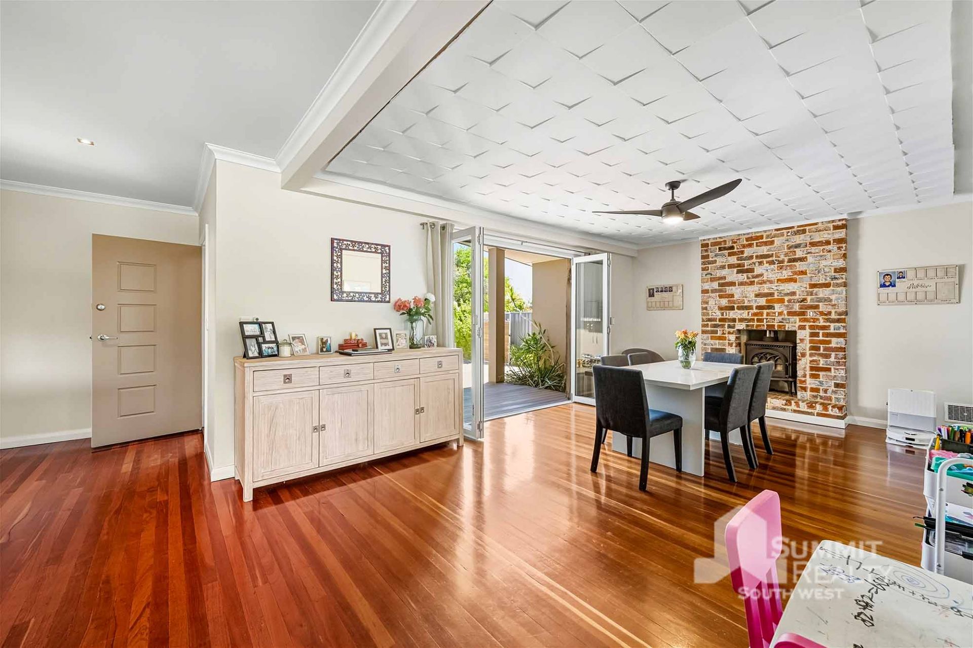Brick feature wall surrounding the fireplace in the dining area