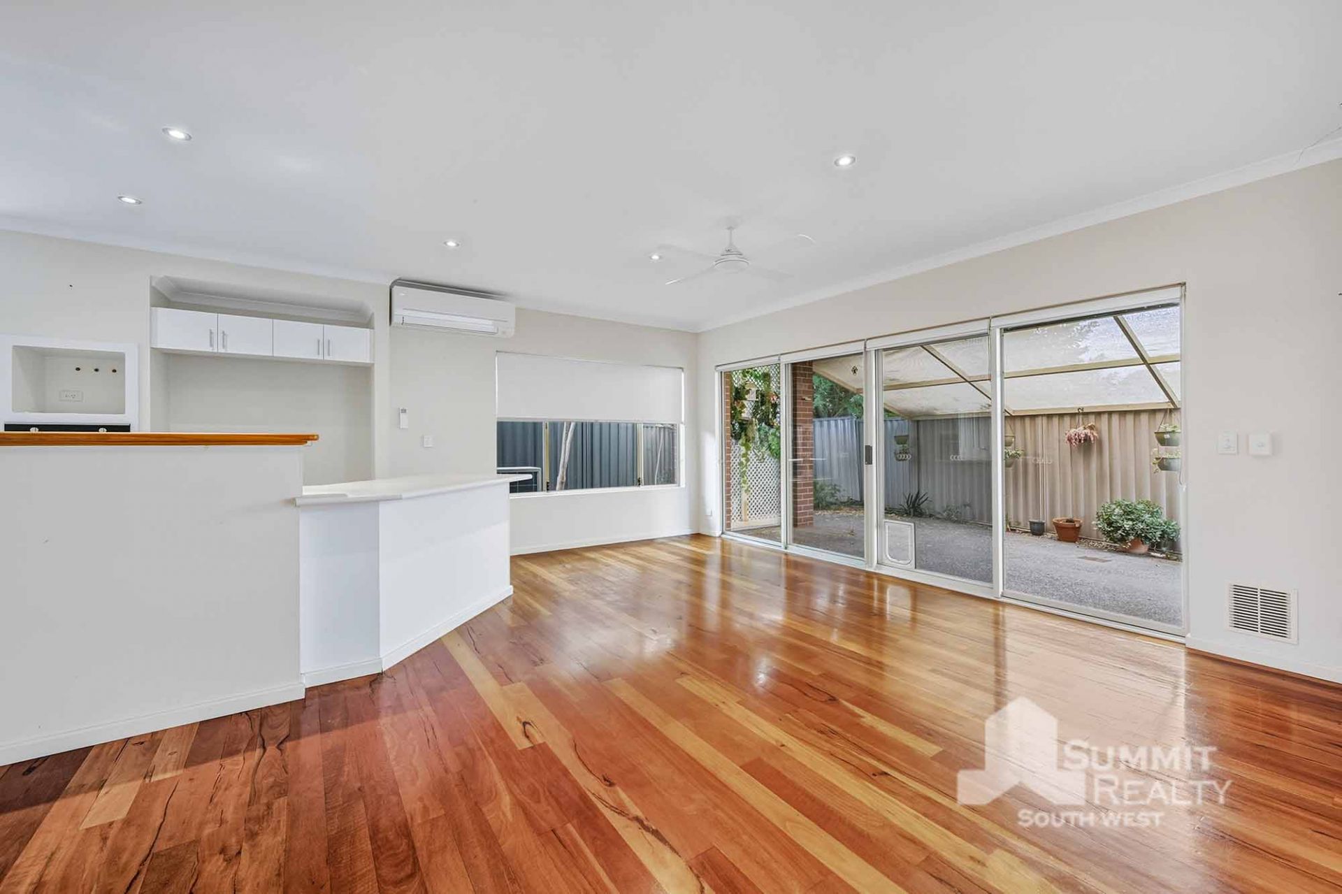 Open plan main living, dining and kitchen, split system air conditioning and ceiling fan/light.