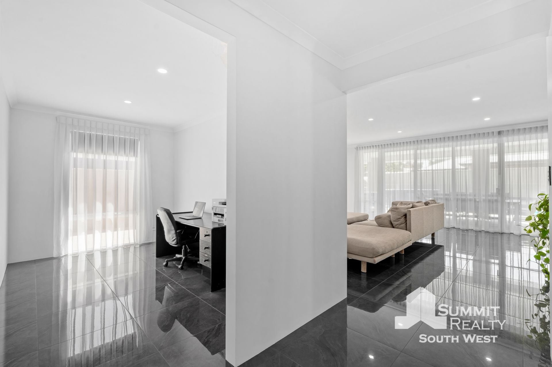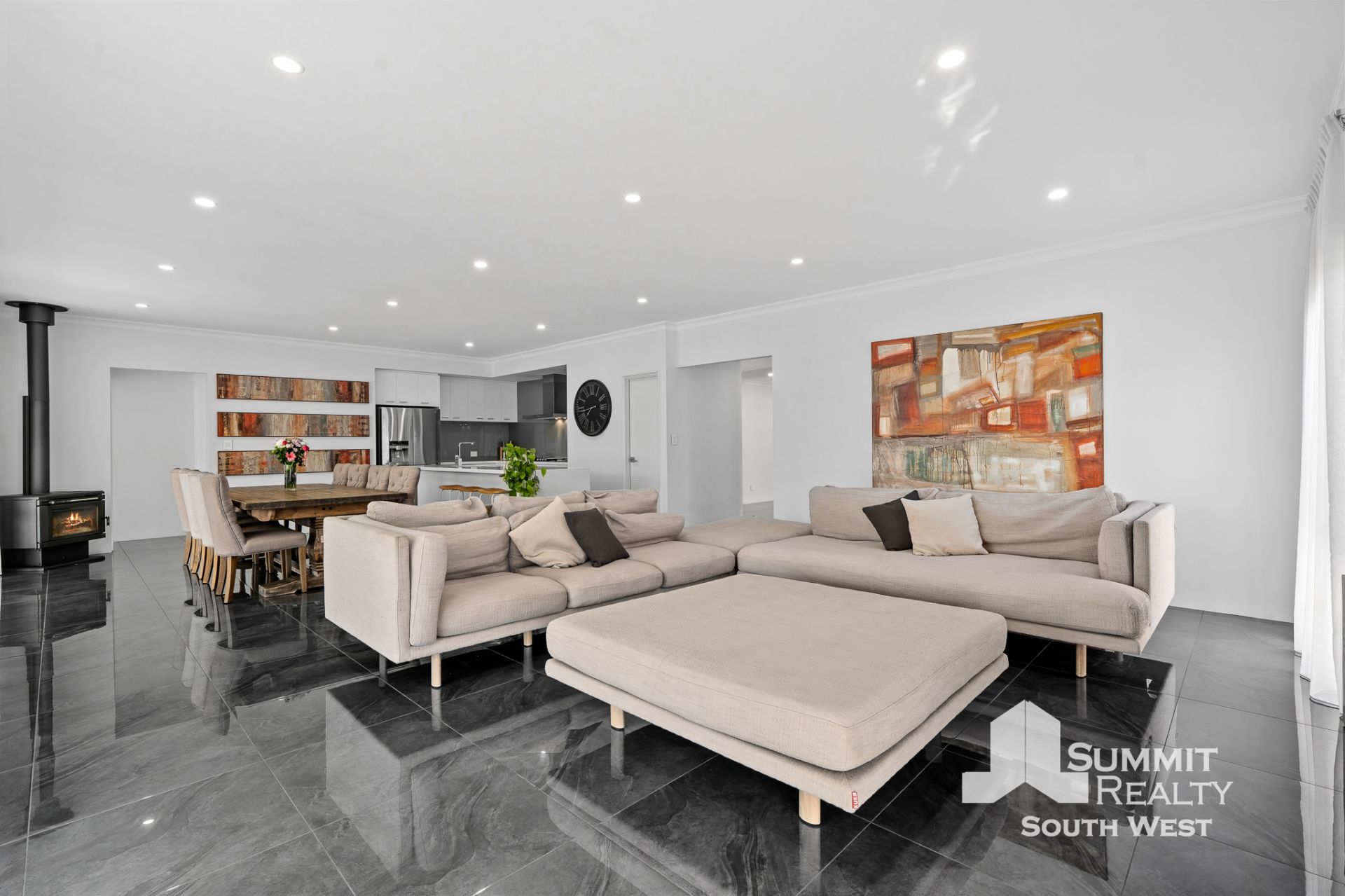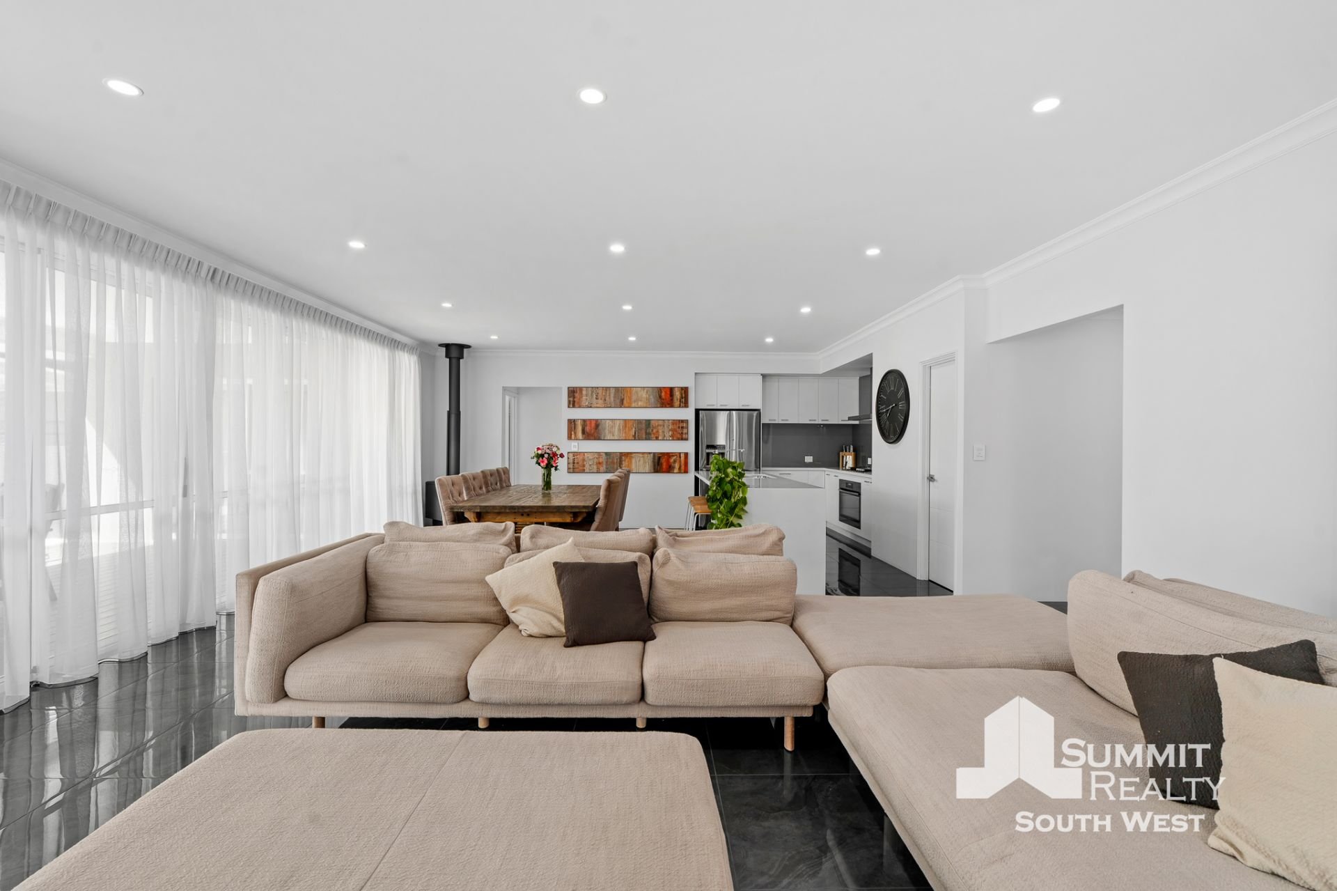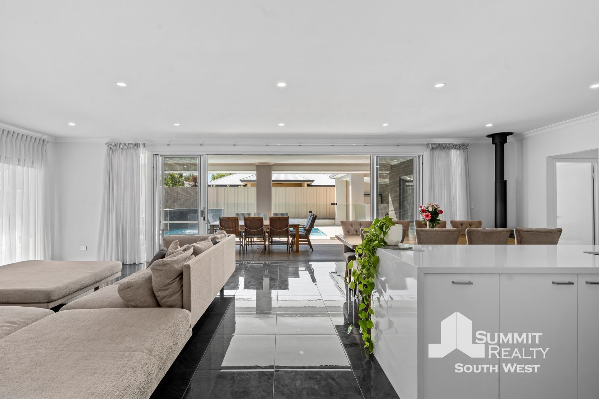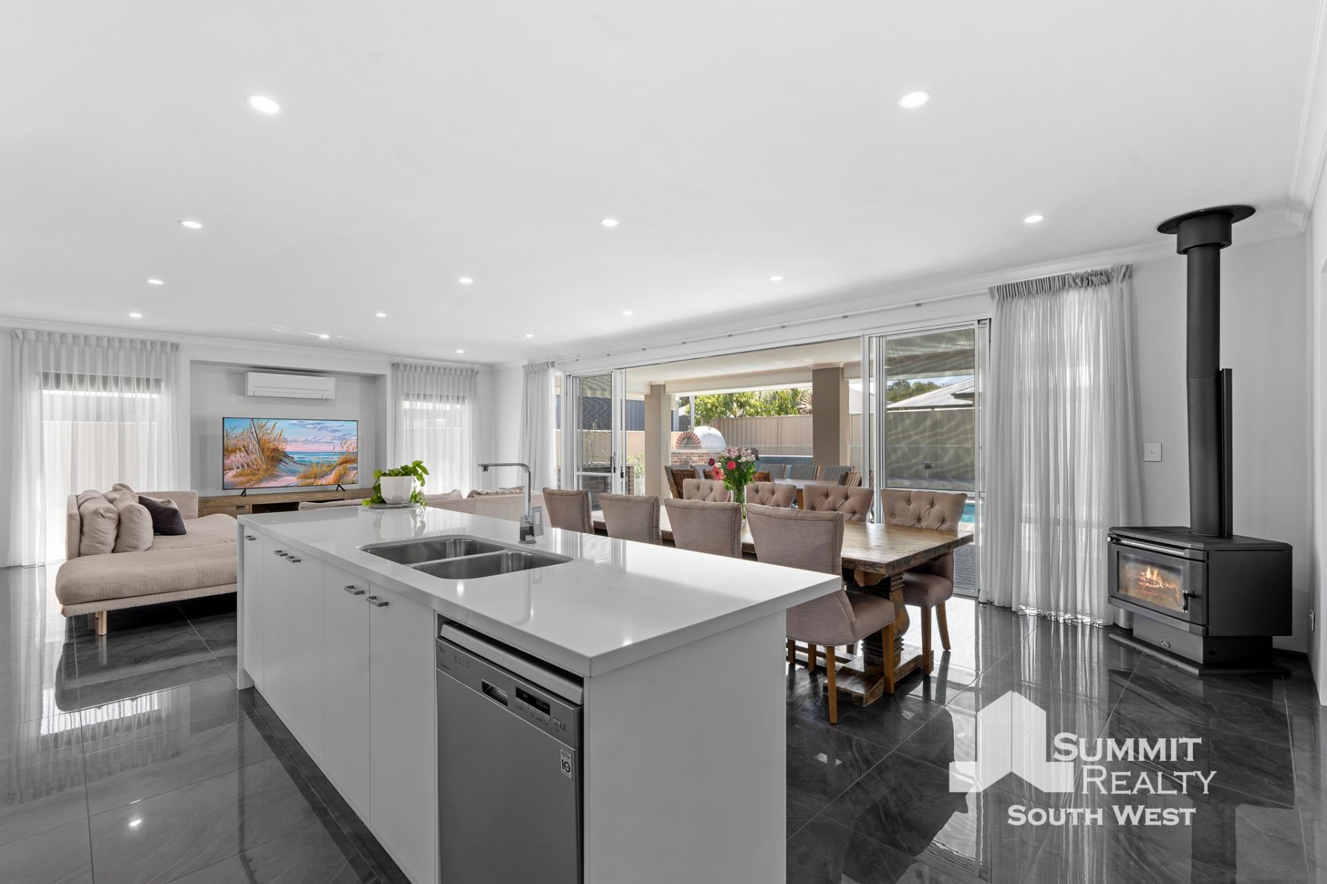 Step inside to a light-filled interior where open plan living takes centre stage. The kitchen, dining and living zone is beautifully finished with marble-look tiled flooring, LED lighting and soft sheer curtains, creating a clean, contemporary feel that’s both practical and inviting. The kitchen is designed for everyday living and entertaining, featuring a generous breakfast bar, ample storage and quality appliances, all overlooking the heart of the home.