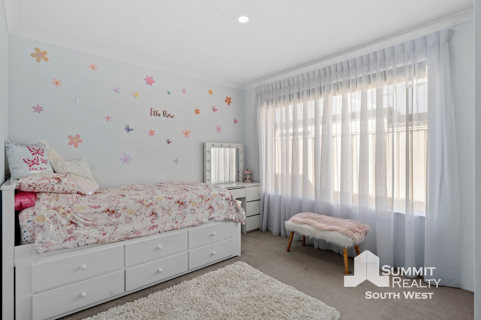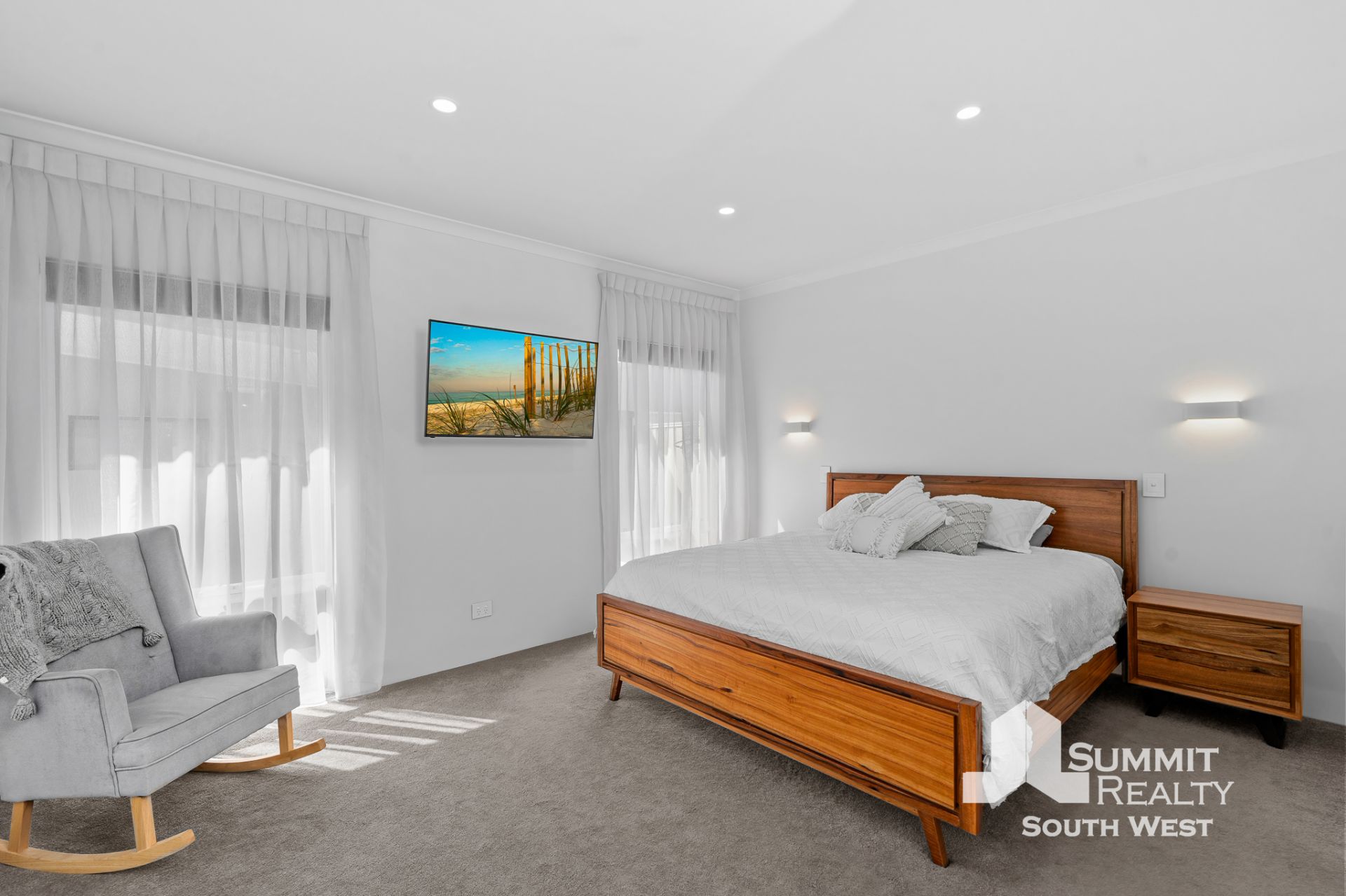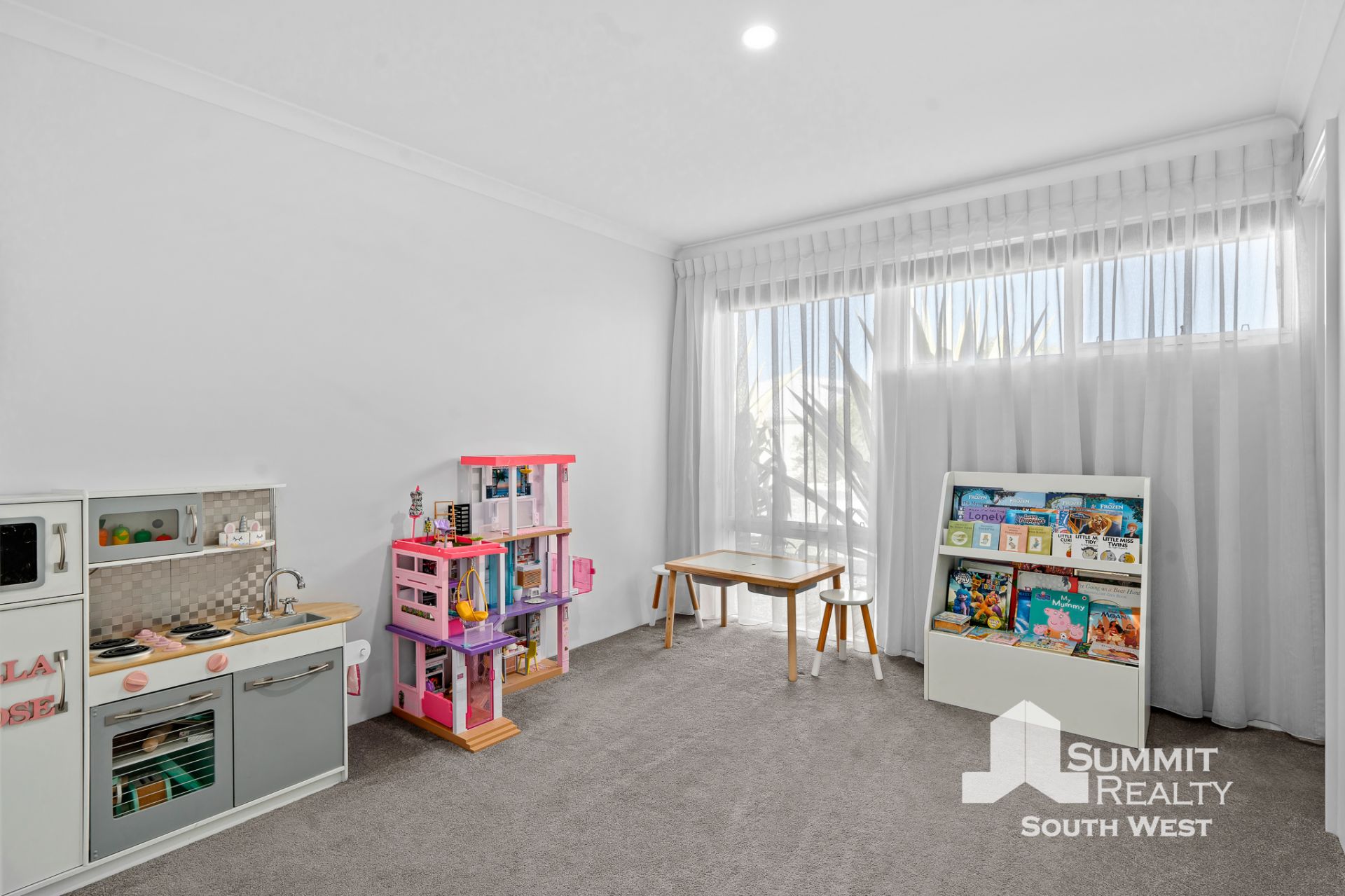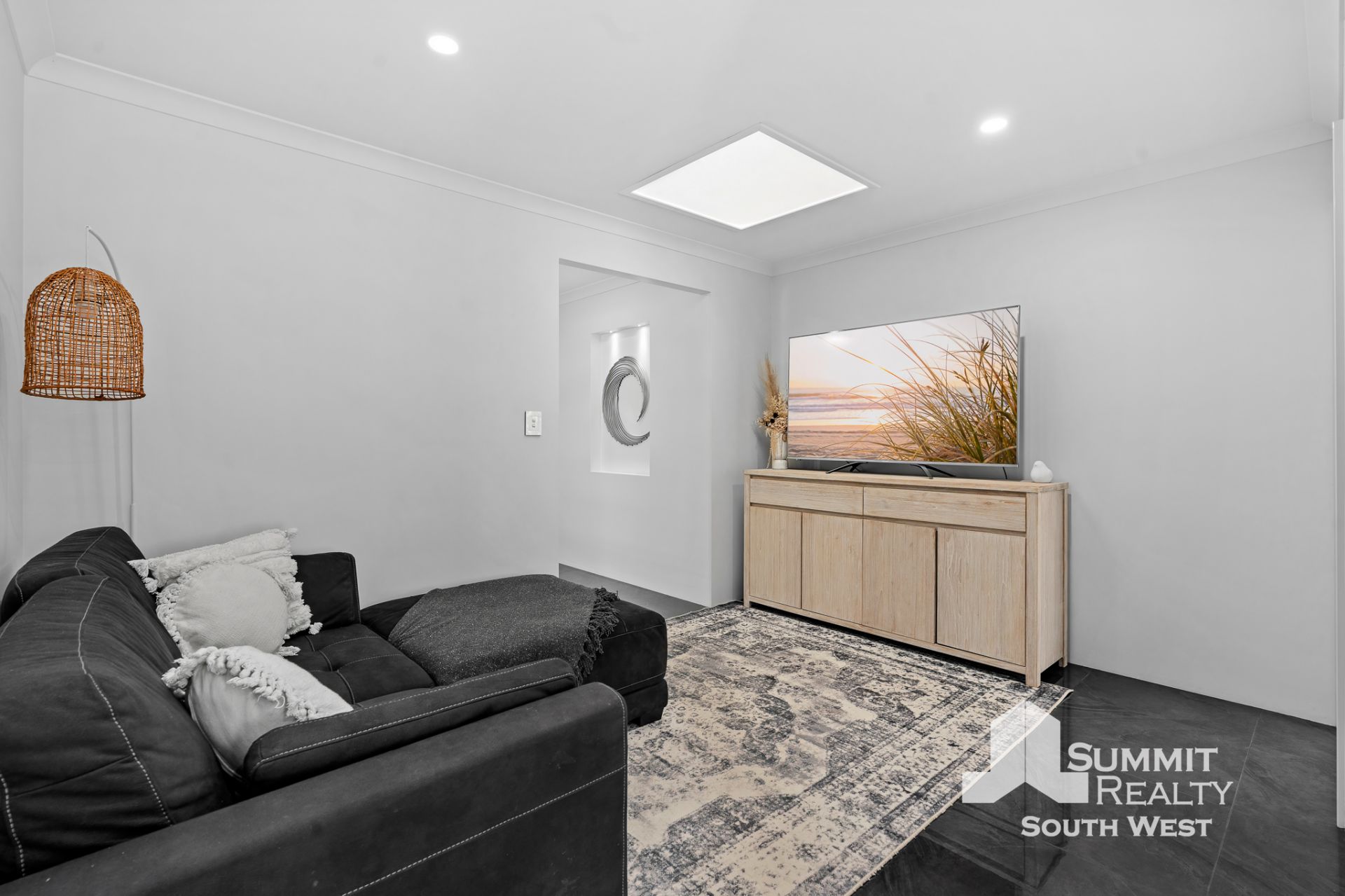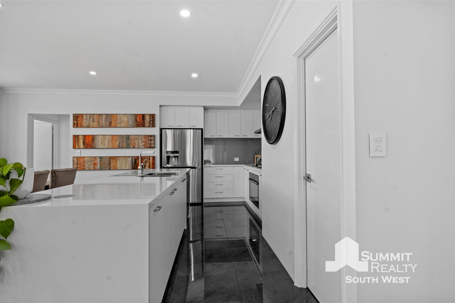 Step inside to a light-filled interior where open plan living takes centre stage. The kitchen, dining and living zone is beautifully finished with marble-look tiled flooring, LED lighting and soft sheer curtains, creating a clean, contemporary feel that’s both practical and inviting. The kitchen is designed for everyday living and entertaining, featuring a generous breakfast bar, ample storage and quality appliances, all overlooking the heart of the home.