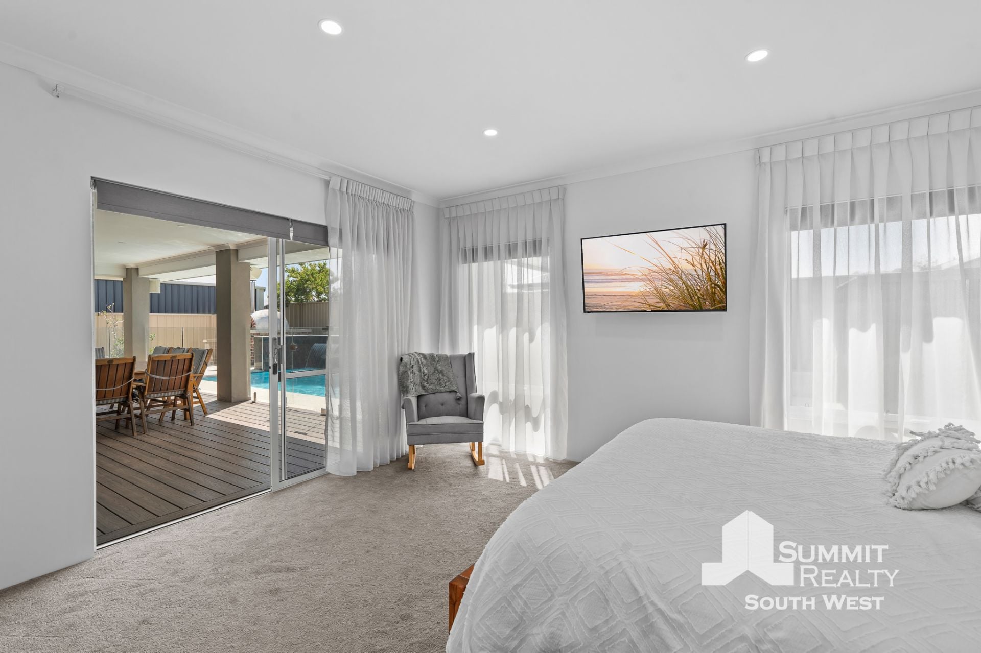 The main bedroom is a true retreat, opening directly onto the alfresco and overlooking the sparkling pool. The ensuite continues the sense of luxury with a double shower, twin basins and sleek, modern finishes – a private space to unwind at the end of the day. The remaining bedrooms are well-proportioned and serviced by a modern family bathroom, making this home ideal for families or those who love to host guests.