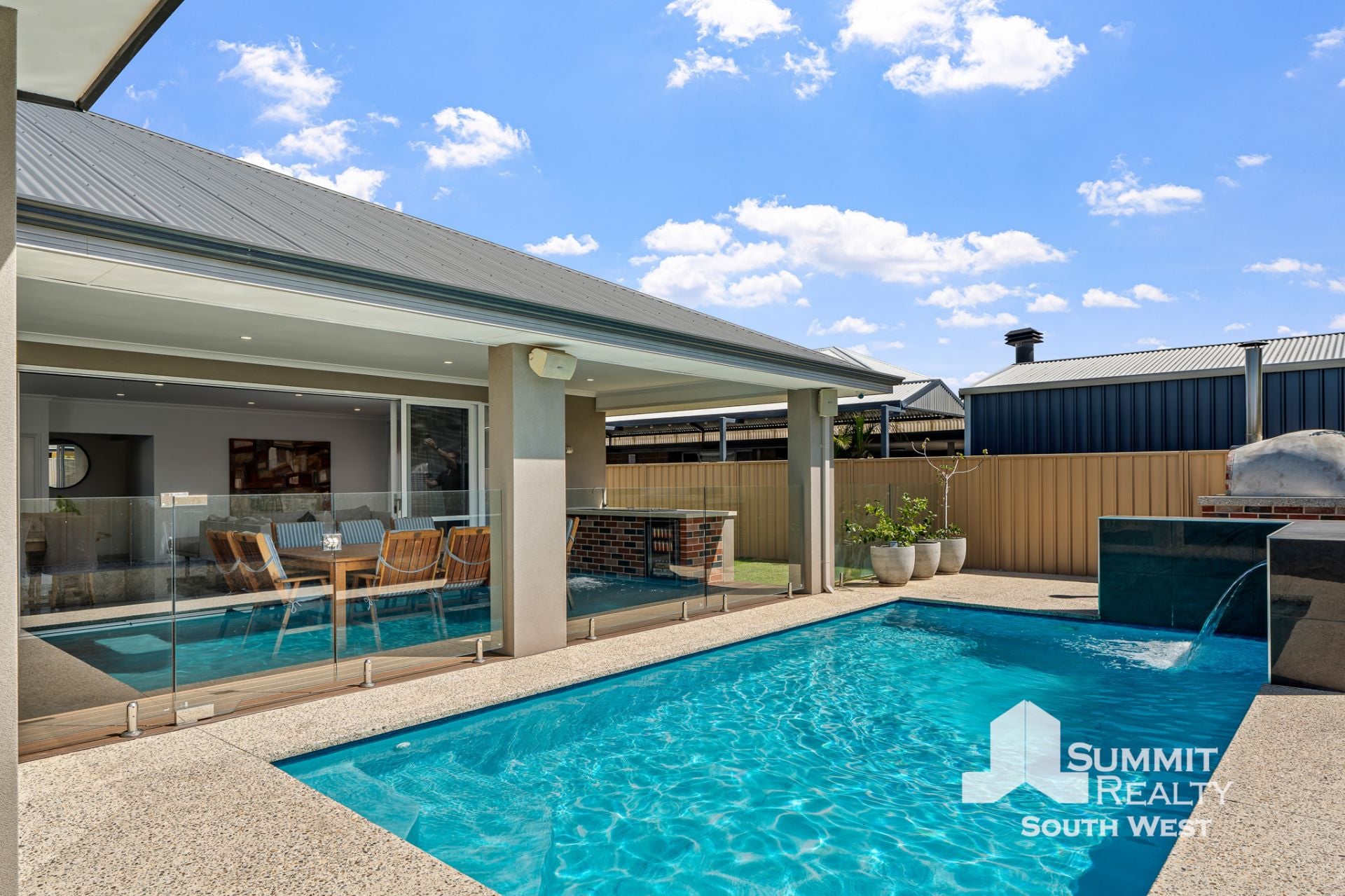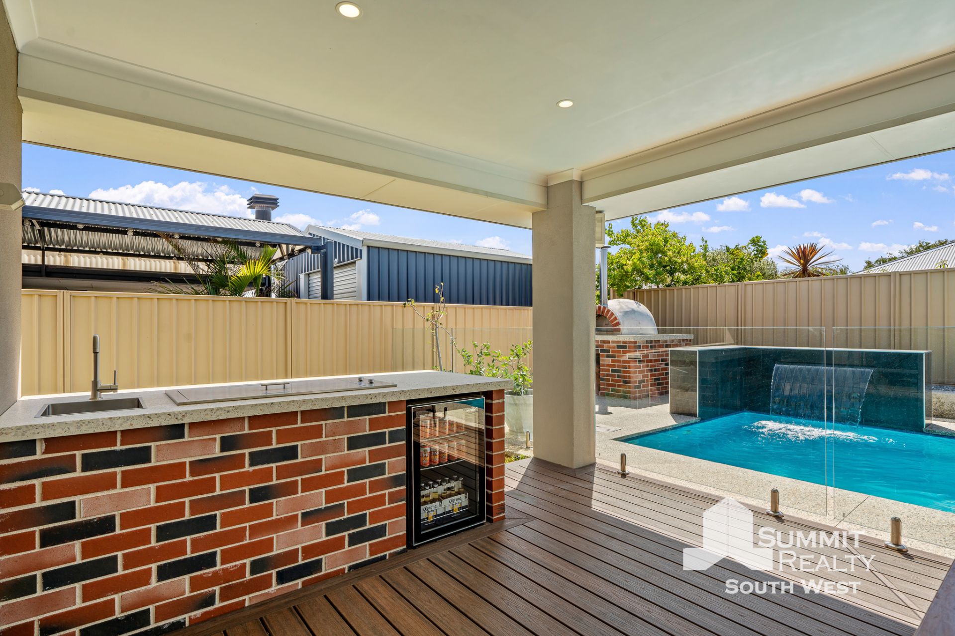 Outdoors is where this property truly shines. The decked alfresco is fully equipped with an inbuilt outdoor kitchen, complete with hotplate and bar fridge, making entertaining effortless. Glass pool fencing frames the exposed aggregate surrounds and striking water feature, while the pizza oven and pool cabana create a resort-style atmosphere you’ll enjoy year-round.