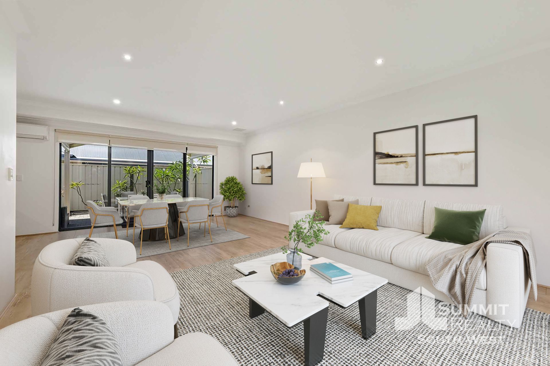 Open plan living and downlights creating a bright, airy feel